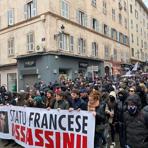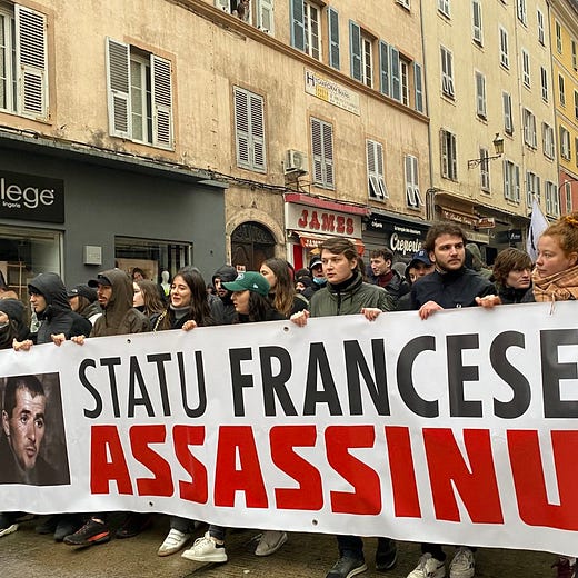 While violence in prisons happens, this is especially bad for the French government as there is a widespread belief that Colonna is innocent [I’m in no position to comment on that]. More importantly, nationalists have been advocating for repatriating Corsican prisoners to Corsican prisons for years, specifically stating that they are threatened by Islamist gangs. [There is an excellent French prison film titled A Prophet, which covers aspects of this.] Colonna’s transfer was repeatedly denied, calling him a “Detainee of Particular Interest” and saying he was thus ineligible for a transfer. [After the attack, this status was lifted for him and his convicted co-conspirators.] Nationalists are placing blame squarely on the French government, with some parties using the slogan “Statu Francese Assassini” [“French State Assassin”] and seemingly going as near as they can to directly accusing the state of hiring the assassin without running afoul slander laws.