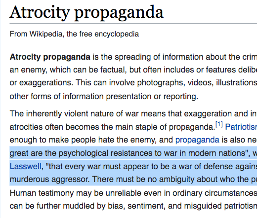 It is hard to find the truth, but it is much less difficult to spot a lie, or at least it should be. You can assume the legacy media’s intention is to misinform and mislead you, the trick is to spot the kernels of truth they throw in to defend themselves against challenges. Atrocity propaganda is very old. For one prominent example, the Romans so maligned the character of the Carthaginian people Punic became a byword for “cruelty.” This is not a difficult topic to study and discover.