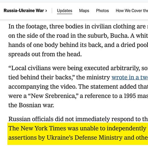 I was late to hear about the alleged Bucha massacre because I was at my sister’s wedding on Saturday where I got drunk and broke my phone [damn dress pants and their pockets.] But when I woke up on Sunday morning it was the first news I saw. Basically, this video was released by “Stratcom Centre UA” [that shows at the bottom on Twitter but not in the Substack embed.]
