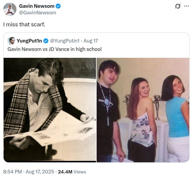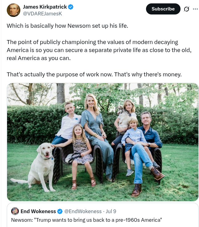 There has also been some amount of focus on Newsom’s beautiful white family, particularly in contrast to JD Vance being married to a woman of Indian descent. I thought this was interesting enough commentary to work as the representative example: