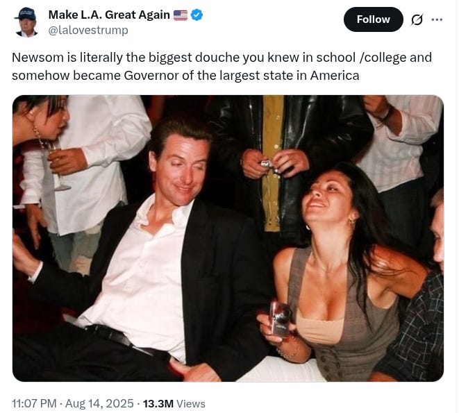 Gavin Newsom is not a smart man, nor a wise man, nor a competent man, and he is certainly not a moral nor a compassionate man. He is a demonstrably terrible political leader. He is basically just an ambitious sociopath with a learning disability who managed to become immensely powerful due to his coping mechanisms combining with a variety of circumstances beyond his control.