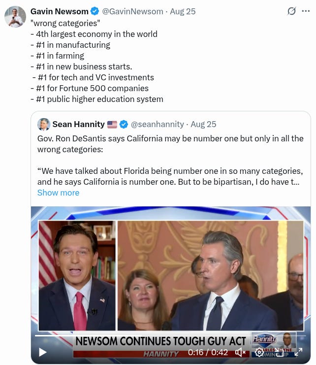 This is in response to Ron DeSantis pointing out that, among other things, California is #1 in homelessness and poverty. This is somewhat normal politician speak, but none of his positive things have anything to do with Gavin Newsom and are primarily simply that California has about 1/3rd more population to the next closest state and is also the major gateway to the Pacific. To Newsom, no narrative continuity is required and while these are major facts and he is on Twitter and thus could have looked them up, the entirety of his political rhetoric is having memorized endless little facts because as per his own description it is impossible for him to memorize or read a prepared speech. I don’t mean to downplay the achievement of overcoming his dyslexia, but the point is it is hard to know how to respond to someone incapable of feeling shame or processing narrative in a normal fashion because it is outside of the experience of almost everyone.