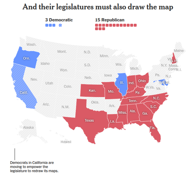 Newsom’s scheme to fight this and hopefully give Democrats a chance at legislative control in 2026 is to pass an initiative, Prop. 50, this November which suspends the commission and puts in districts that will give Democrats 5 more seats. If this passes he may be a hero to national Democrats, but its passage is far from sure, and there will be endless lawsuits. The bigger problem is that in a national redistricting fight Democrats are at an enormous disadvantage. For a state to be able to do that and gain from it, the legislature has to be allowed to draw the map [as opposed to a non-political commission], the same party has to control both chambers and the Governor’s Mansion [or have a veto-proof majority or be in a state that doesn’t require the governor’s signature], as well as being in a state with seats to take. The New York Times provides this map of states where those conditions are met: