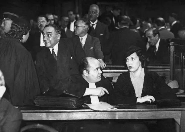 Mme. Stavisky, the widowed mother, spent 14 months in prison awaiting trial. Left destitute and certainly unable to find support from her husband’s “friends,” it was their governess who took care of her children, supporting them out of her own savings. When they went to visit, she was moved to a hospital and put in a false cast to shield the children as much as possible from the sad new reality of their lives. She was finally provisionally released in May, 1935, some months before the trial.