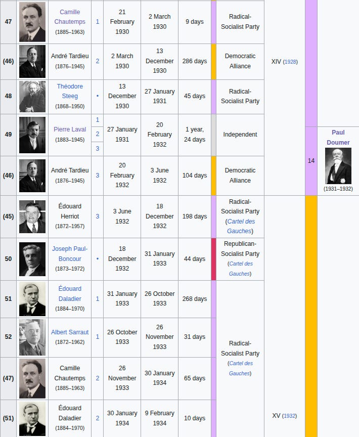 Sober observers in France- to the extent that any existed besides foreign journalists like Alexander Werth and Janet Flanner- would have found it obvious that no specific elected government was responsible for what had happened, particularly given the incredible political instability of the Third Republic in this era, as one can see from this table of the governments in the years leading up to and during the scandal: