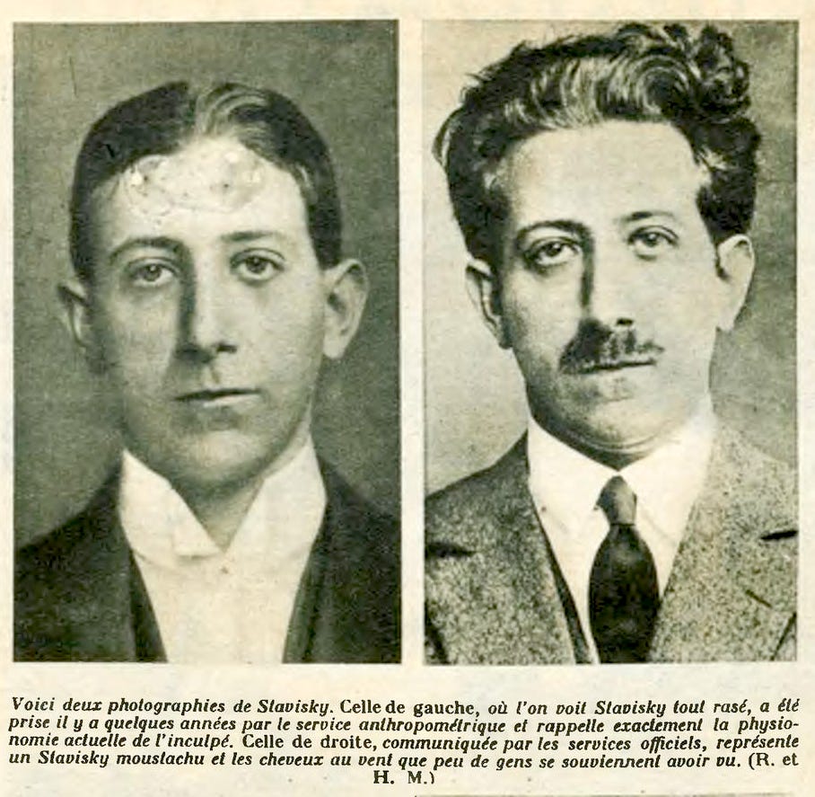 For the following story my most important source is the 1934 text France in Ferment by Alexander Werth, a Russian émigré British journalist who spent the 1930s covering France. My other sources are the American journalist John Gunther’s Inside Europe1 and Paris Was Yesterday, a collection of pre-war writing by Janet Flanner (about whom I happen to have recently reviewed a book for the New York Post.) I will only be giving citations for direct quotes, but for the most part follow Werth, which I believe is the most thorough contemporary English-language account.2 The archives of both the New York Times and Time Magazine also both proved useful, in which case I have just used hyperlinks. I would add here that this case produced extraordinary amounts of rumor and contradictory reports, and I am almost exclusively using sources from 1934-1936, so I apologize if I repeat anything which was later determined to be inaccurate (on the off chance some Stavisky expert comes along to notice.)