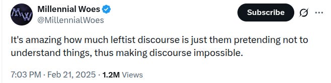 The term has somewhat fallen out of favor due to it causing nothing misunderstandings, but it is instructive here to think about the beloved wokist phrase “social construct.” This meant something totally different to the left than to the right, because in the academic sense it just means “a way we have organized society” but to the right understood it as “this is fake and should be ignored.” Of course, the left does commonly want to tear downs the things that organize society, but basically meant it as a pseudo-intellectual way to say “this is not a natural law it’s a system of organization.” Marriage, for example, is clearly both a social construct and real. My point is that obviously Englishness is real and is comforting- life is hard and every society is filled with various social conventions to make people feel comfortable and understand their place within society. It is only this awful class of post-modernists who want to rapidly change society in ways that would make any normal person feel alarmed and uncomfortable and then tell them they shouldn’t worry about it because all of the things which made society make sense for hundreds or thousands of years were actually fake and can be ignored. Regarding this, Adam describes why liberals are so egregiously frustrating as succinctly as anyone has,