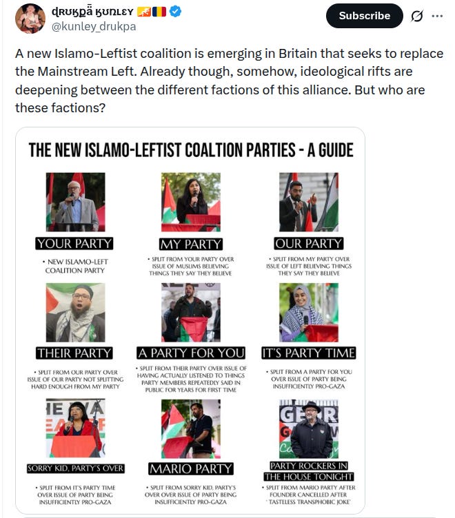 I should add as a comment for my primarily American audience that while Trump has been awful in a variety of ways, the “vibe shift” has been genuine and immensely liberating. Britain is potentially only one election away from the same thing happening, though Farage’s Reform Party would have most of Trump’s greatest faults, IE slavish devotion to Israel, strict “hate crime” and “hate speech” enforcement only for Jews, and endless South Asians lecturing you about what it means to be British1, a topic which the text gets into at some depth. Like me, the character has no particular issue with Islam itself but just thinks there has been too much immigration and not enough assimilation, unlike people who are so fanatically anti-Islamic that they believe they are in “one struggle” with Israel, Hindus, and Nigerian Christians against Islam. While it never got quite as bad in America, much of what is described in the story is not substantially different from American life in 2024, though it feels a thousand years away now. I would encourage any Americans who should choose to read this text to remember that this is indeed the society that the Democrats want for us.