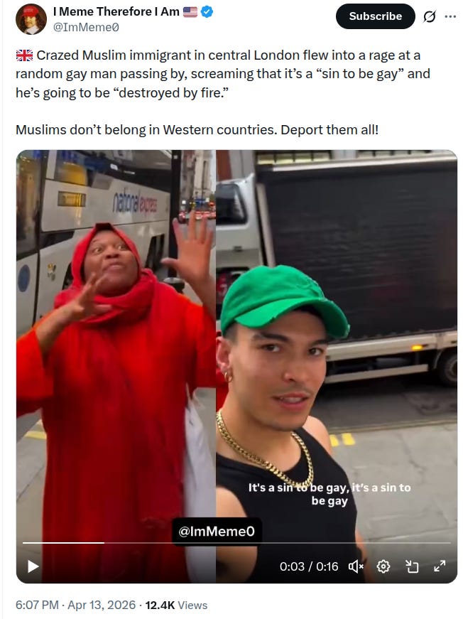 This exact thing drives me crazy, and it is under-discussed. The (non-Evangelical) Zionist right has decided that sodomy is a core Western value despite that they almost universally thought homosexuality was wrong 20 years ago. Here in America, home of the famous “God Hates Fags” church (whatever happened to those people?) it is somehow assumed that only Muslims might oppose homosexuality on religious grounds. This is all profoundly frustrating as someone who strongly opposes immigration on practical and theoretical grounds but who has no particular animus against Islam and does not believe we’re locked in some civilizational struggle. I mean, here is some content I just happened to see on Twitter in the time I was planning this article: