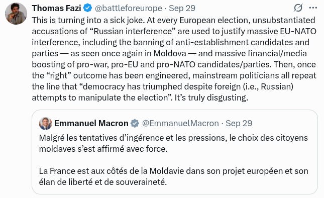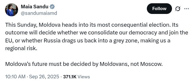 In one of the dumbest and most transparent information operations we have yet experienced, the EU has pulled out all the stops to ensure the “European future” of the tiny and impoverished nation of Moldova. Split between Romanian and Russian speakers after a long history of being pulled at from all sides, the Eurocrats have decided expanding into Moldova is a key priority for the bloc and have made up endless stories about how Russian pressure on this election was unprecedented. Leading the charge is Moldova’s “Pro-Western” President Maia Sandu, who was probably created in a test tube in the basement of Columbia SIPA, though they laundered her education off on the almost equally dreadful John F. Kennedy School at Harvard. The former central banker and World Bank employee has made an art form of screaming “Russia, Russia, Russia” in an attempt to bring Pantsuit Mafia government to Moldova [though it should be noted that she herself prefers a somewhat more old-fashioned dress suit.] I say art form, but she is more like a crude technician: no one could possibly believe her wild claims and like propagandists the world over in 2025, she doesn’t seem to care.