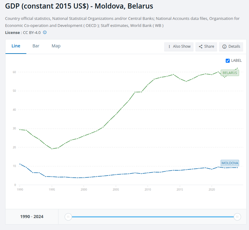 Anyway, back to the matter at hand, Moldova has sputtered on as a weak, impoverished, dysfunctional, and partitioned state for some 35 years. Like Ukraine, it never really left post-Soviet hell, and in fact also never recaptured the “prosperity” of the late Soviet Union. Of course, they want to blame Russia for this, but you can see this chart comparing its economy to Belarus, which stayed firmly in Russia’s orbit and which reformed as little as possible, that it is Moldova that has under-performed, to put it mildly: