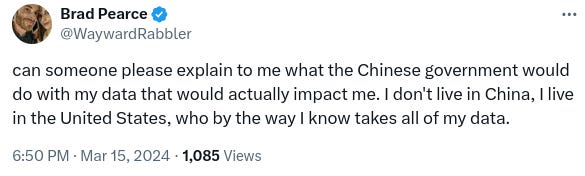 I'd add..., home-grown (US) big tech - aka, Google for instance, sees the threat of such a powerful search algorithm in Tiktok has in drawing youth away from its run-of-the-mill (inferior) search engine, and hence is all too pleased to have seen its lobbying of Congress to push for the banning. Just like 5G and Huawei... Tiktok will suffer the same fate. Instead of out-innovating the competition, ban them.